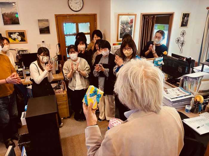 そんな中、製作室で打ち合わせ中、突然社員に取り囲まれて、「ナニ、ナニ!仕事しなさい!」とか慌ててたら「誕生日おめでとうございます!」と声をかけられ、プレゼントまでもらいました。